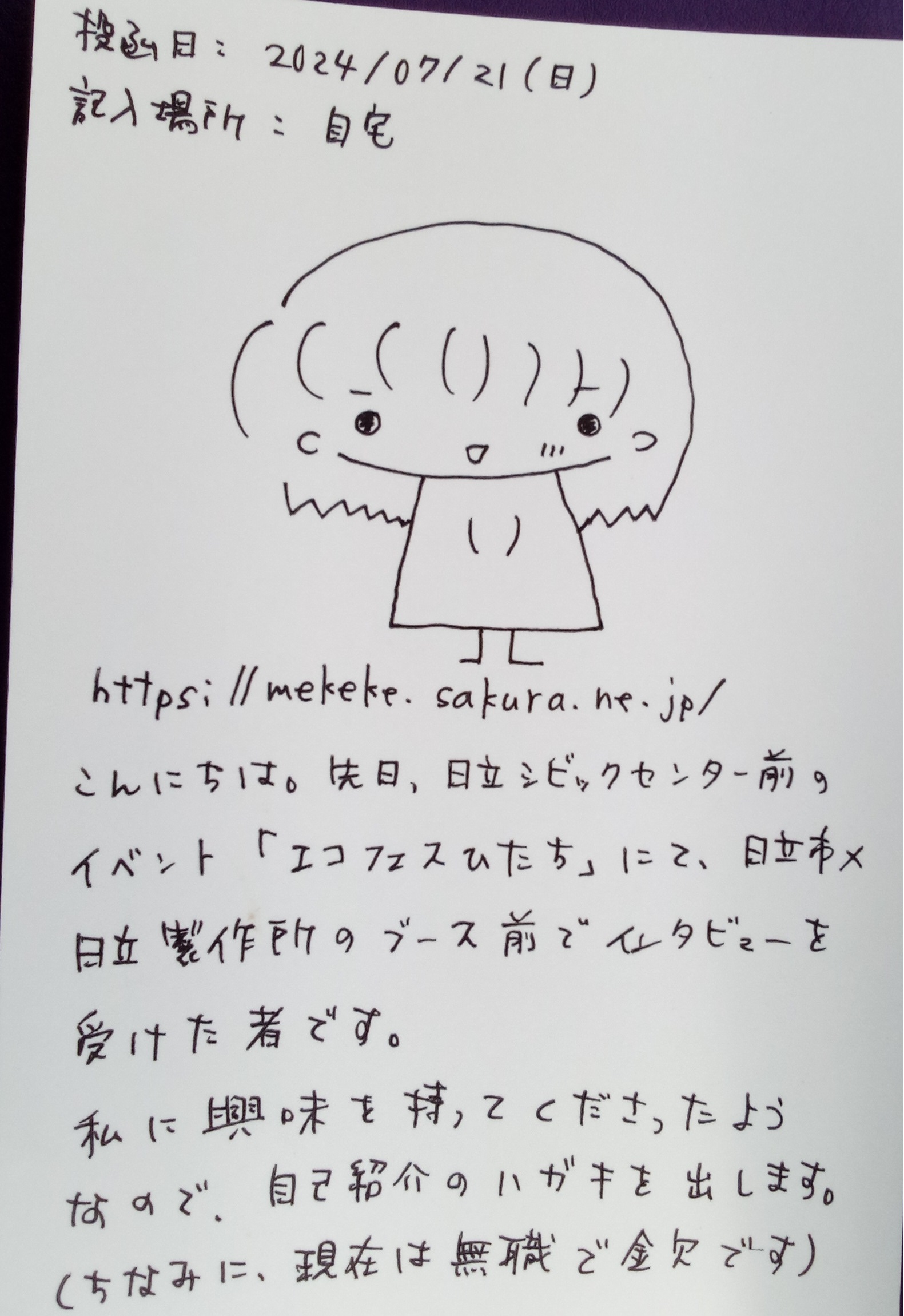 2024/07/20(土)にエコフェスひたち2024に参加したとき、新都市広場(日立シビックセンター前の広場)でNHKの記者の方からインタビューを受けました。 そのときの感想コメントはこちらです。 コメントに書いた通り、「今後、何か必要があれば、こちらから記者の方に連絡することもできるのだ」ということに着目したため、ご挨拶のために出したハガキの文面が左の画像です。(画像をクリックすると、縮小なしの画像が別ウィンドウで開きます) ちなみに、「今現在は無職で金欠です」と書いておりますが、目下のところ、8月一杯までの間の仕事は見つけました。 その先の生計の立て方は謎に包まれておりますが、やってみたいことは色々あるので、破産しないように気を付けながらやりたいようにやります。はい。 (今後の住宅ローンの支払いに苦戦する予感がしすぎていて遠い目をしながら) |